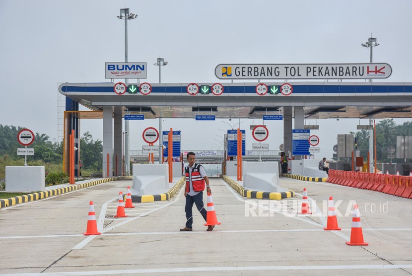 Seorang petugas menyiapkan pembukaan fungsional Tol Pekanbaru-Dumai Seksi 1 di Kota Pekanbaru, Riau, Senin (23/12/2019). PT Hutama Karya membuka Tol Pekanbaru-Dumai Seksi 1 sepanjang sekitar 9 kilometer secara gratis untuk masyarakat untuk bisa digunakan pada mudik liburan Natal dan tahun baru, pada tanggal 23 Desember 2019 hingga 2 Januari 2020. ANTARA FOTO/FB Anggoro/foc.