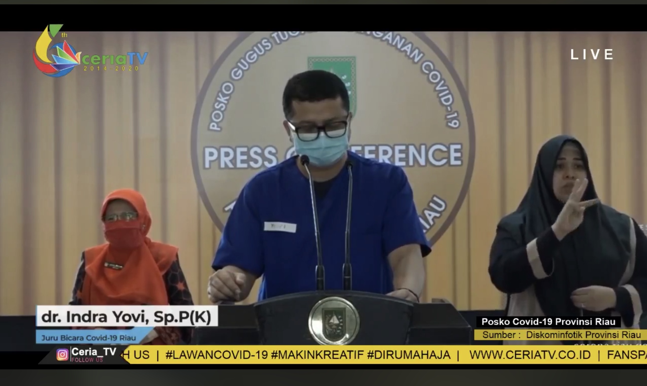 Centro Riau,Pekanbaru-Juru Bicara (Jubir) Penanganan Covid-19 Provinsi Riau, dr. Indra Yovi mengatakan terdapat penambahan 4 kasus positif, sehingga total kasus Covid-19 di Provinsi Riau sebanyak 99 kasus.