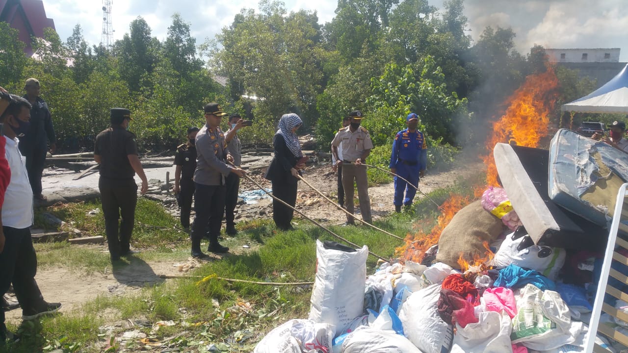 “Untuk barang yang dimusnahkan terdiri dari 1 set tempat tidur bekas, 250 karung baju bekas, 3 unit sepeda baru, serbuk kapur dan cat cair, 1 karung cabe kering dan 1 karung bawang putih,” jelas Kasat Polair Bengkalis