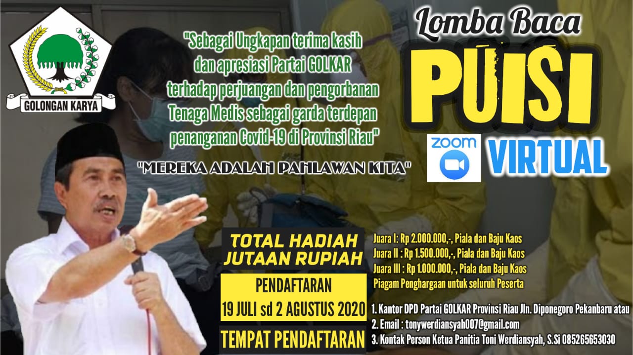 ToWer;”Apresiasi Kepada Tenaga Medis Covid-19, Golkar Riau Gelar Lomba Baca Puisi” 2 min read RIUH PEKAN ToWer;”Apresiasi Kepada Tenaga Medis Covid-19, Golkar Riau Gelar Lomba Baca Puisi” Redaksi July 27, 2020 Read More