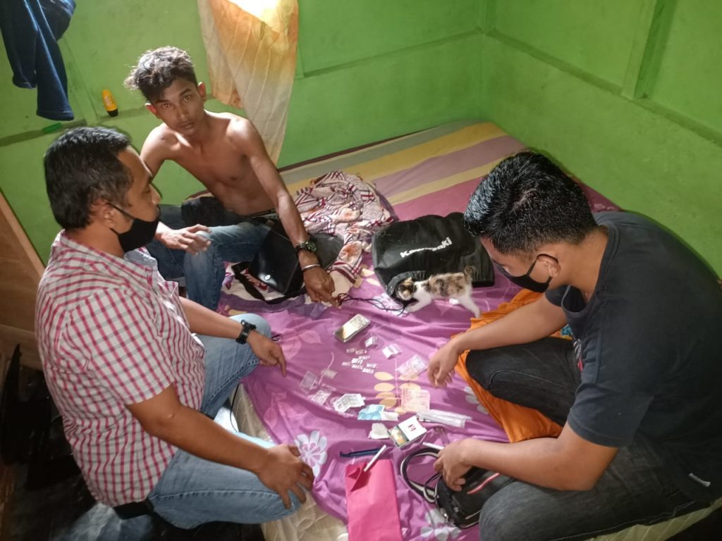 Dalam penggeledahan tersebut petugas menemukan barang bukti berupa; 9 paket plastik bening berisikan butiran kristal diduga narkotika Gol-I jenis shabu, didalam tas sandang warna hitam didalam kantong kain merk Kawasaki warna hitam, yang tergantung disebelah lemari dalam kamar pelaku.