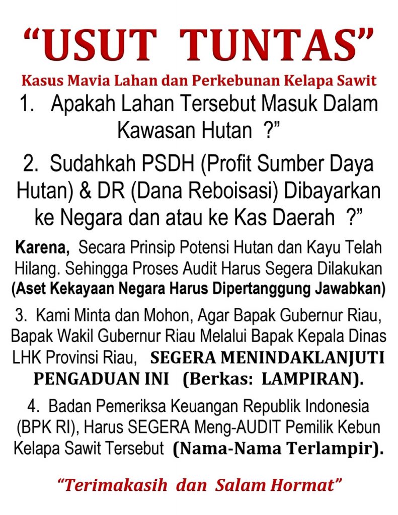 - Agar Pihak Kejaksaan Tinggi Riau maupun Kejaksaan Negeri Rokan Hilir Memperjelas Penertiban 453 Hektar Kebun Kelapa Sawit Milik Ir Siswaja Muljadi alias Aseng. “Kalau Memang Ditertibkan, Kenapa Sampai Saat ini Kebun Tersebut Masih Dikuasai Aseng ?” tegas L. Yunus S.Sos.Sc., SE., CLA., M.Si (Ketua Umum Gabungan Lembaga Anti Korupsi Indonesia)