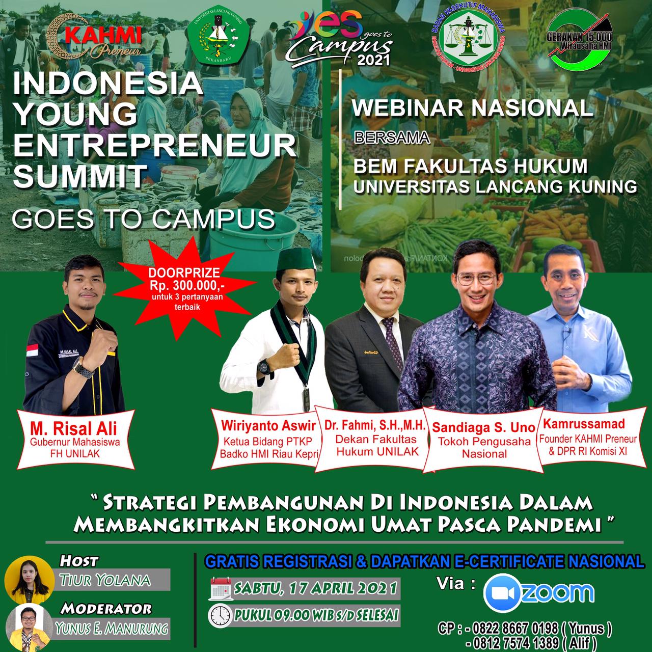 CENTRO RIAU Nusantara- – BEM Fakultas Hukum Universitas Lancang Kuning bekerjasama dengan Indonesian Young Entrepreneur Summit dan KAHMI Preneur menyelenggarakan seminar nasional secara online dengan tema “Strategi pembangunan di Indonesia dalam membangkitkan ekonomi umat pasca pandemi” Sabtu, 17 April 2021 Pukul 09.00 WIB.