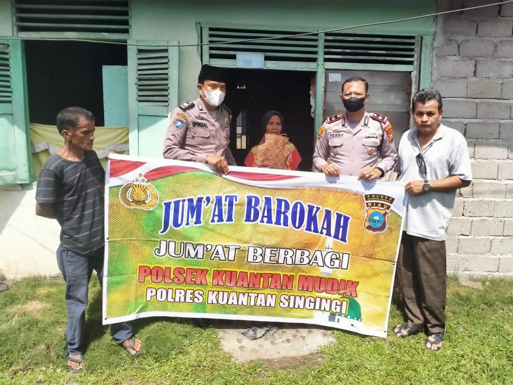 KUANTAN SINGINGI – Kapolsek Kuantan Mudik Iptu Ferry M Fadillah,SH bersama Personil melaksanakan Kegiatan Jum’at Barokah dengan bersedekah sembako kepada Masyarakat kurang mampu di Wilayah Hukum Polsek Kuantan Mudik Kabupaten Kuansing Riau Jumat (27/5/2022) sekira pukul 10.00 WIB.