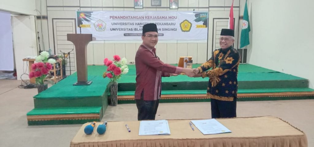 CENTRO RIAU Kuansing– Universitas Islam Kuantan Singingi (UNIKS) dengan Universitas Hang Tuah Pekanbaru (UHTP) bersepakat jalin kerja sama tentang pendidikan, penelitian, pengabdian kepada masyarakat dan peningkatan kualitas sumber daya manusia serta dukungan terhadap program merdeka belajar-kampus merdeka (MBKM). Kesepakatan tersebut ditandai dengan penandatanganan naskah Memorandum of Understanding (MoU) antara kedua belah pihak yakni Rektor UNIKS Dr. H. Nopriadi, S.K.M., M.Kes dan Rektor UHTP Prof. Dr. H. Syafrani, M.Si, berlangsung di Aula UHTP, Kamis (03/06/2022).