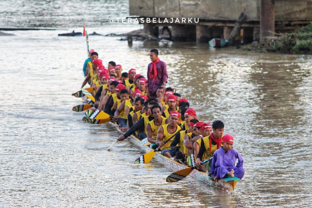 CENTRO RIAU GUNTOR -Jalur Rajo Bujang dari desa Padang Tanggung kecamatan Pangean ‘Tancap Gas’ saat melawan Tuah Inayan Mandulang Untuang dari desa Pulau Aro kecamatan Kuantan Tengah, pada hari pertama Pacu Jalur Tradisional Ajang Uji coba kecamatan Gunung Toar Tepian Teluk Bayur Pasar Gunung, kabupaten Kuansing Kamis, 28 Juli 2022.