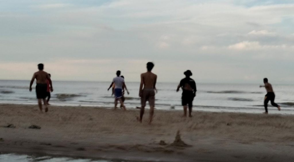 Penulis melihat, Ketua Karang Taruna Provinsi Riau, Muhammad Andri ST dan kawan-kawan mengisi waktu sore dengan berolahraga Sepak bola pantai di Pantai Lapin yang berpasir putih nan bersih itu.