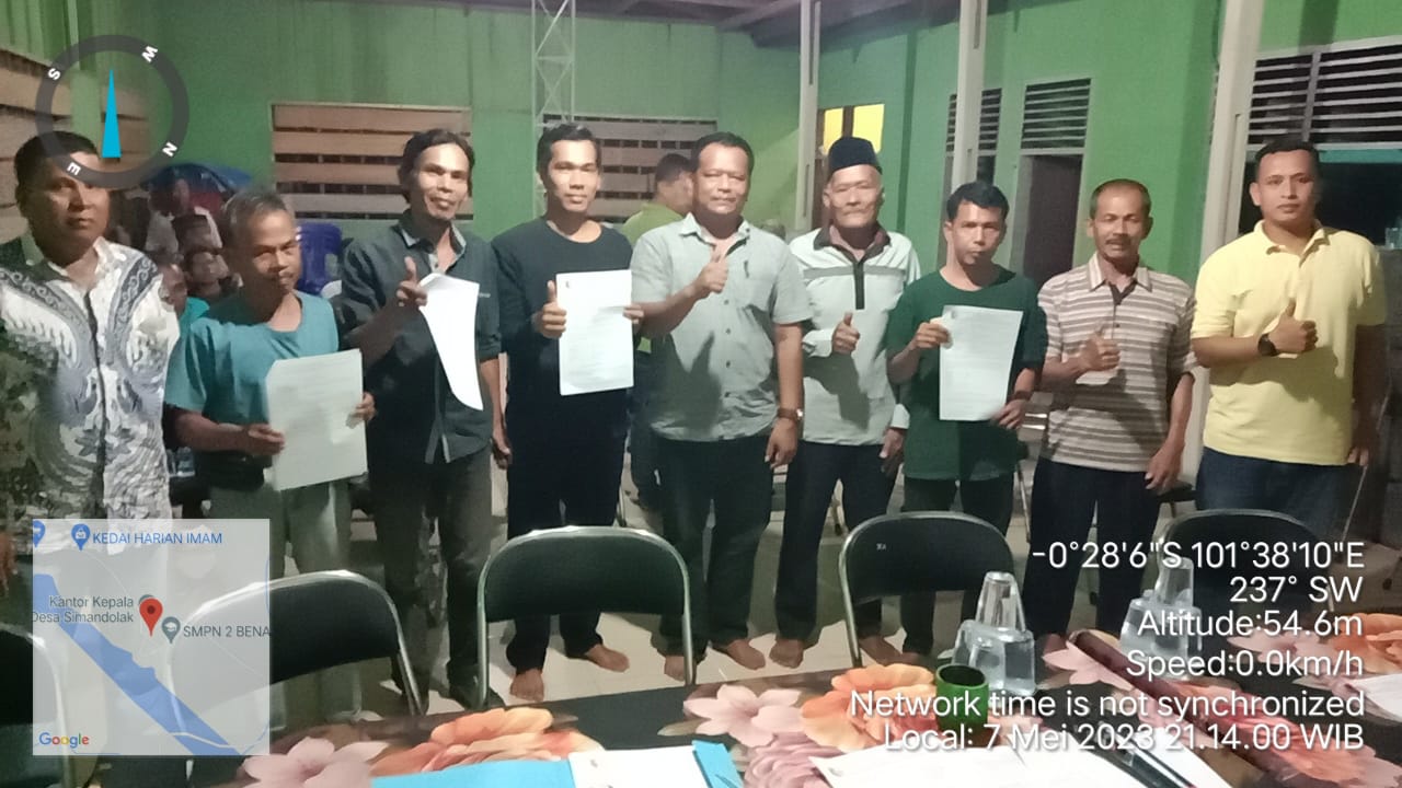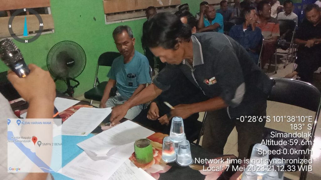 Penandatanganan perjanjian kerjasama siaga tanggap darurat ini dilaksanakan pada hari Minggu tanggal 7 Mei tahun 2023 puku 20:30 WIB di Kantor desa Simandolak.