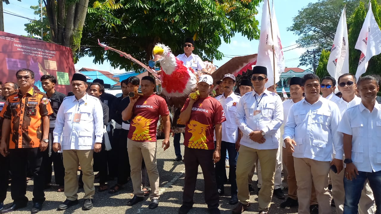 Didampingi ratusan kader Gerindra Kuansing , H Suhardiman Amby di arak menggunakan tandu berbentuk burung dari kawasan Terminal Teluk Kuantan, hingga di depan gerbang masuk kantor KPUD Kuansing.