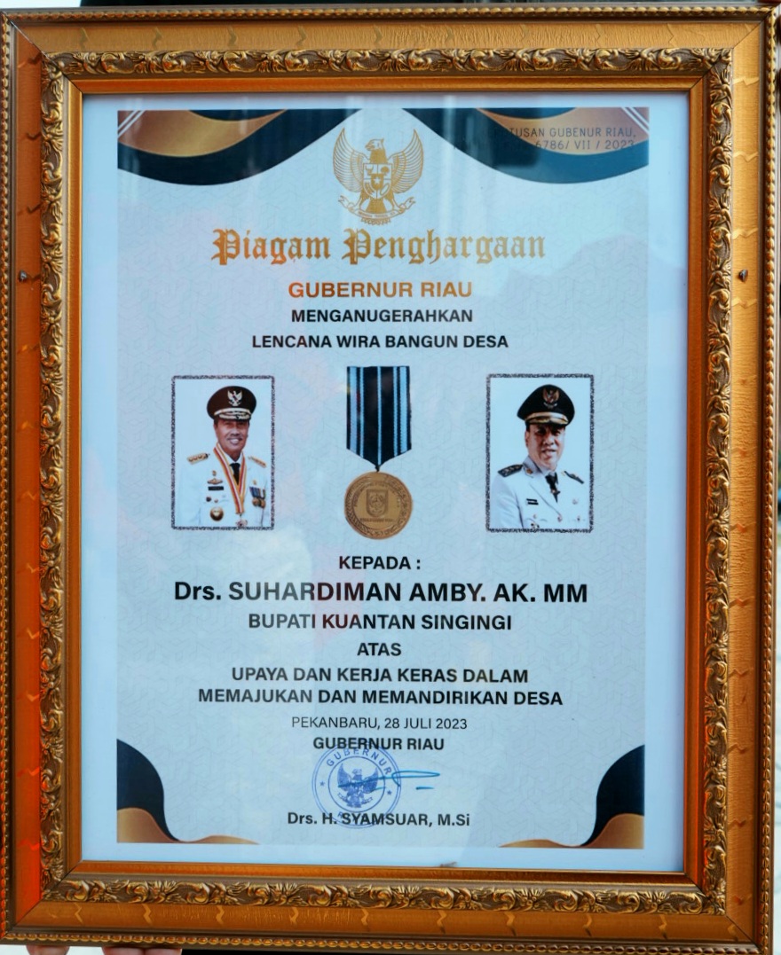 Berhasil Jadikan Desa Kuansing Mandiri, Bupati Suhardiman Terima Penghargaan Dari Gubernur Riau