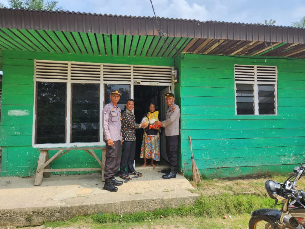 CENTRO RIAU Kampar Kiri -Kapolsek Kampar Kiri Kompol Rahmadani, SH dan Panit I Binmas Ipda Nofrizal yang didampingi oleh RT.03 RW.04 Apri, Kelurahan Lipat Kain Kecamatan Kampar Kiri, memberikan Bansos kepada warga yang kurang mampu, Senin, 30 Oktober 2023.