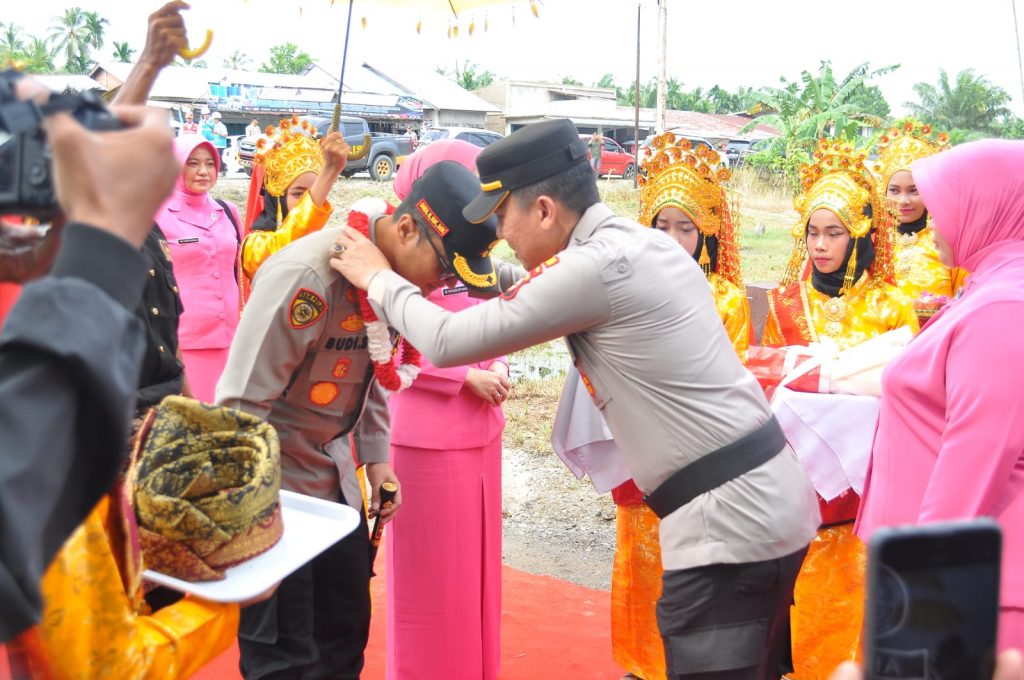 Kapolres Indragiri Hilir AKBP Budi Setiawan, SIK, MIK dan Ketua Bhayangkari Cabang Indragiri Hilir Ny. Furi Budi Setiawan tiba di Mapolsek Kempas disambut hangat dan penuh ceria oleh Kapolsek Kempas AKP Mardani Tohenes, SH, MH didampingi Ketua Bhayangkari Ranting Kempas Ny. Dwi Mardani, dengan pengalungan bunga dan pemberian buket bunga, kemudian dilakukan pemasangan tanjak kepada Kapolres Indragiri Hilir dengan tradisi adat melayu oleh Ketua LAMR Kec. Kempas Bpk. Ibnu Sofyan sekaligus tepung tawar dan tabur beras kunyit, setelah itu pertunjukan Pencak Silat disertai Gendang.