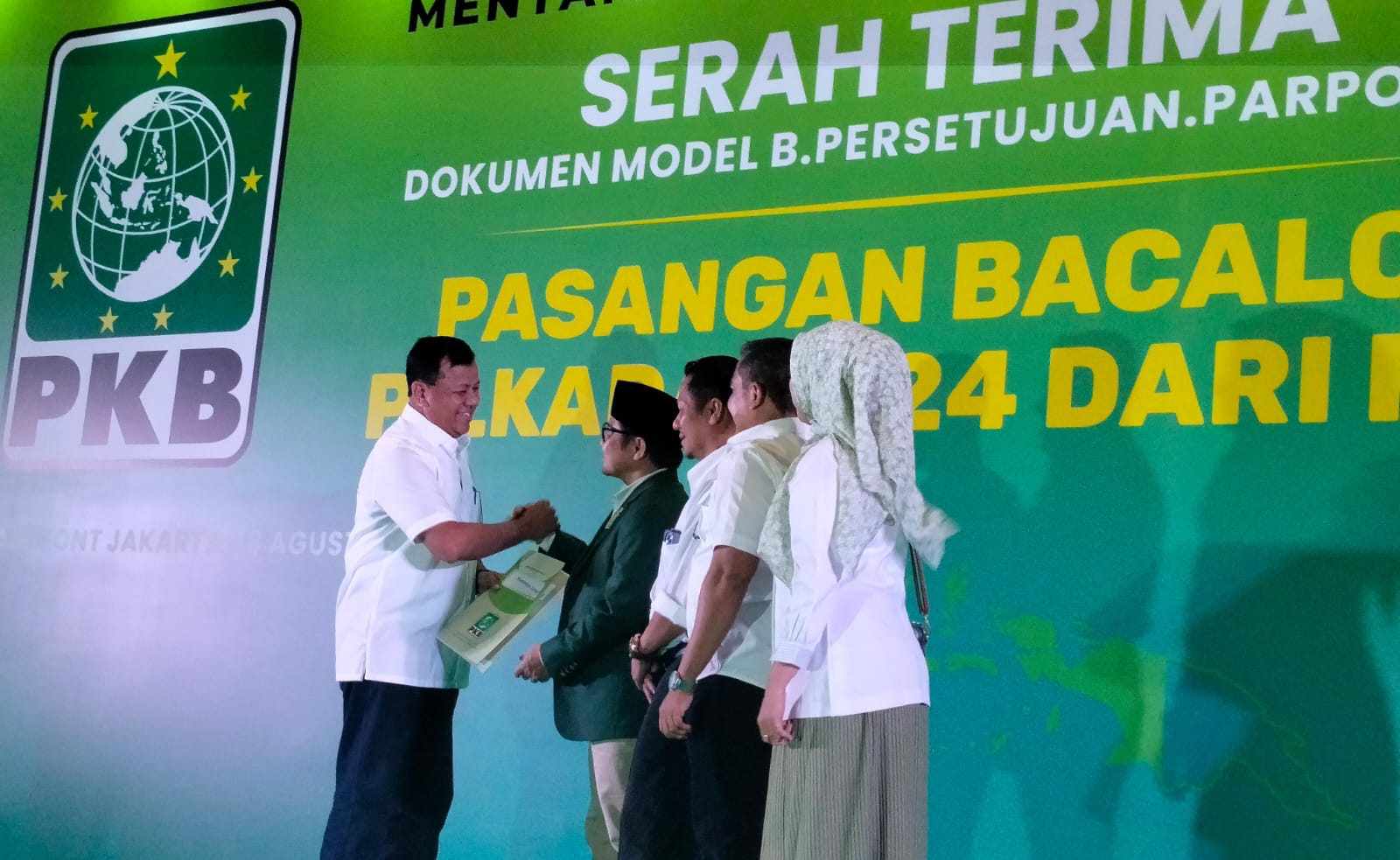 Dukungan itu dituangkan dalam surat yang diserah Terimakan berupa Dokumen Model B, Persetujuan. Parpol. KWK yang dan ditandatangani oleh Ketua Umum DPP PKB, H A Muhaimin Iskandar dan Sekretaris Jenderal, M Hasanuddin Wahid.