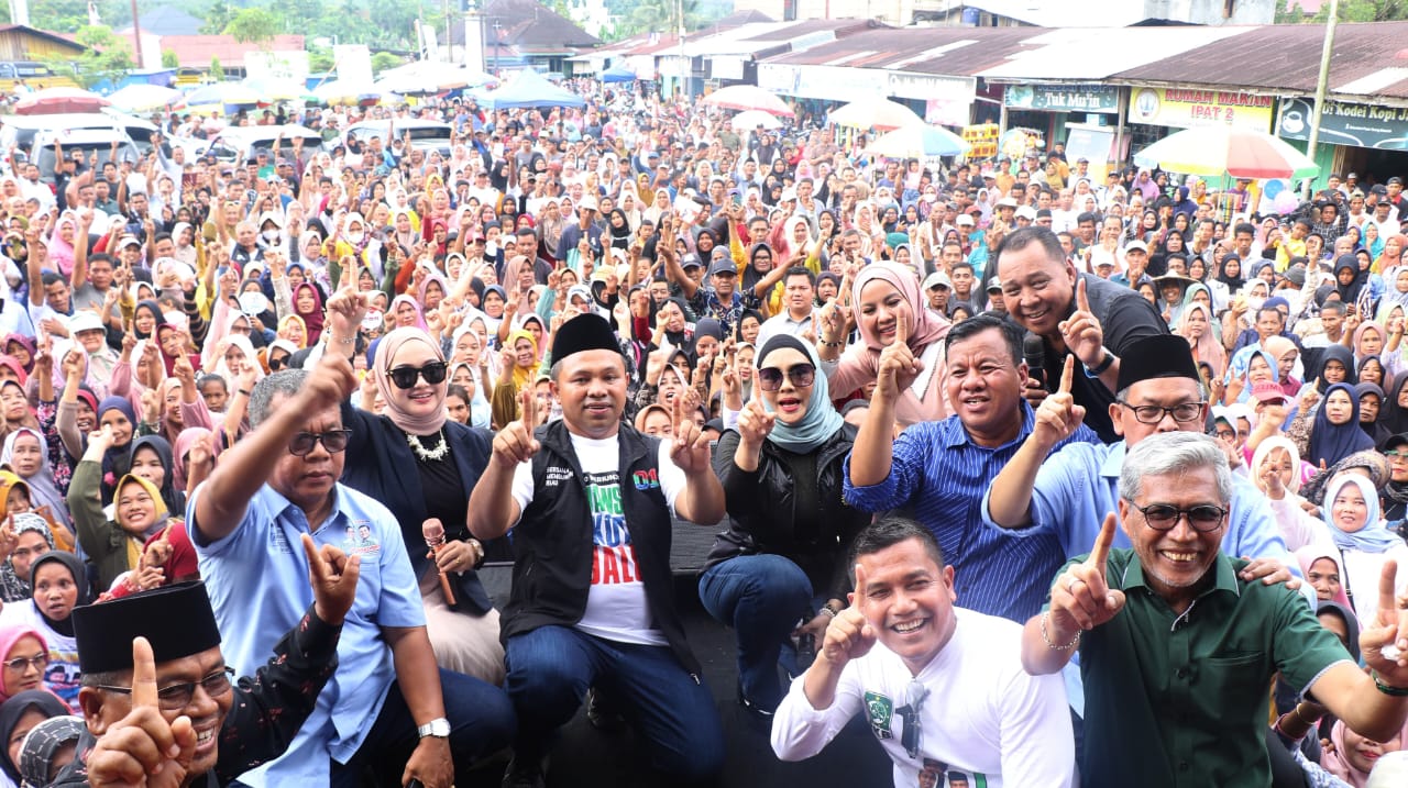CENTRO RIAU TELUK KUANTAN-Dua anggota DPR RI dari Partai Kebangkitan Bangsa (PKB), H. Mafirion dan Iyeth Bustami, mengajak ribuan masyarakat Kuantan Singingi untuk mendukung pasangan calon nomor urut satu (1) dalam pemilihan Gubernur Riau dan Wakil Gubernur Riau, H. Abdul Wahid-SF Hariyanto dan begitu juga untuk Paslon Bupati Kuansing nomor urut (1) Dr. H. Suhardiman Amby, MM-H. Muklisin di desa Sungai Bawang, kecamatan Singingi, kebupaten Kuansing, Riau (18/11/2024).