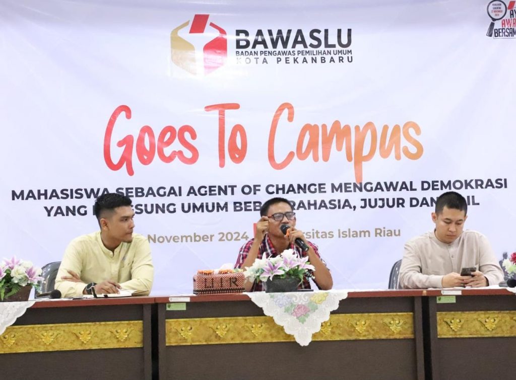 Centro Riau Pekanbaru -Badan Pengawas Pemilihan Umum (Bawaslu) Kota Pekanbaru mengadakan kegiatan Sosialisasi “Mahasiswa Sebagai Agent of Change” dengan Tema “Mengawal Demokrasi yang Langsung Umum bebas Rahasia Jujur dan Adil ” di Ruang Auditorium Pascasarjana UIR di Lantai III pada Jum’at (15/11/2024).