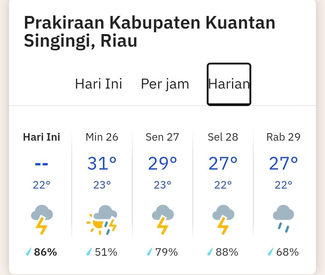 Seperti dikutip dari JPNN.com Forecaster On Duty BMKG Pekanbaru, Mia V mengatakan pagi hari berpotensi hujan dengan intensitas ringan hingga sedang terjadi di sebagian wilayah Kabupaten Kampar, Pelalawan, Rokan Hulu, Kuantan Singingi, dan Kota Pekanbaru.