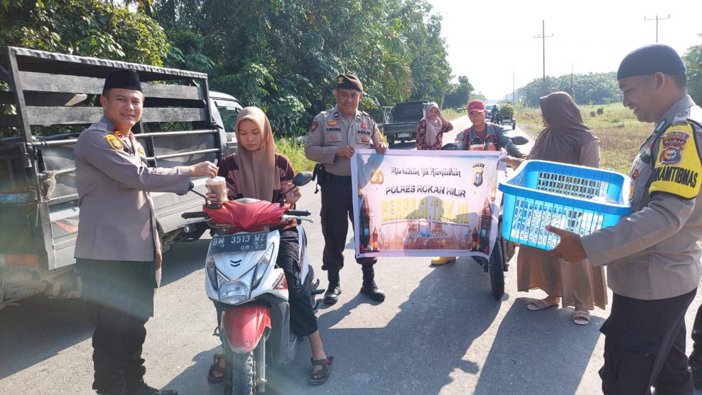 Centro Riau Rohil-Dalam Rangka Operasi (Ops)Tertib Ramadhan Lancang Kuning tahun 2025, Polsek Rantau Kopar yang dipimpin langsung Kapolsek, Iptu Riko Rizki Masri, S.H, M.H berbagi Takjil untuk pengguna Jalan Raya di bulan suci Ramadan 1446 H yang penuh berkah. Pada Kamis 6 Maret 2025 di depan Markas Komando Polisi Sektor (Mako Polsek) Rantau Kopar, Kecamatan Rantau Kopar kabupaten Rokan Hilir, Riau.