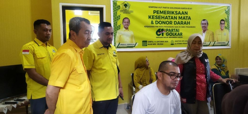 Centro Riau,Pekanbaru : Memperingati hari ulang tahun Partai Golkar ke-61 tahun, jajaran DPD dan DPC Golkar seriau menggelar berbagai rangkaian kegiatan bakti kesehatan dan bakti sosial lainya. kegiatan yang digelar di Sekretariat DPD Golkar Riau, Jalan Utama Kecamatan Tenanyan Raya Pekanbaru diikuti Ratusan warga disekitar Kantor DPD dan masyarakat di Kecamatan Tenayan Raya. (Sabtu/11/10/2025)