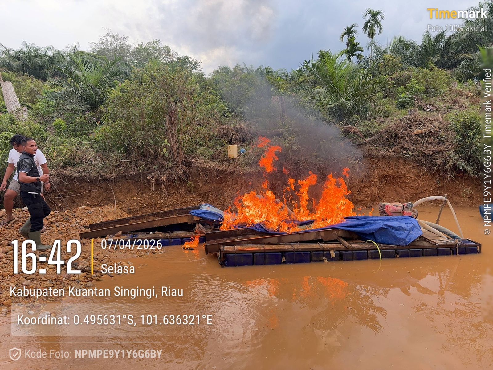“Menurut laporan ke kami ada 7 Unit, tapi di lokasi hanya ditemukan tiga unit rakit dalam kondisi tidak beroperasi. Untuk mencegah kembali digunakan, seluruh rakit tersebut langsung dimusnahkan dengan cara dibakar semua peralatannya” jelas Ipda M Ali Sodiq S.Sos dengan wajah memerah kehitaman terpancar ke Awak Media ini. Diduga karena uap panasnya api.