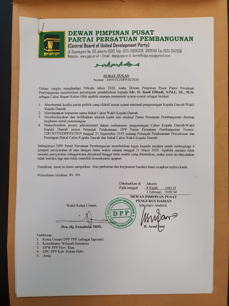 Centro Riau,Jakarta-DPP PPP telah memberikan surat keputusan Nomor 2459/TG/DPP/2020 yang menyatakan dan menugaskan Rusli Efendy sebagi Calon...